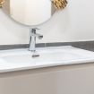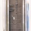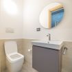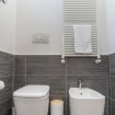 L’ingresso immette in un corridoio sulla cui sinistra si apre il primo bagno, quello di servizio. L’impatto è subito notevole: il colore azzurrino metalizzato delle pareti, trattate come fossero a stucco veneziano, abbinato a un gioco di luci molto particolare e ai grandi listoni del parquet chiaro a terra dichiarano subito la modernità dello stile che impronta l’intero appartamento.